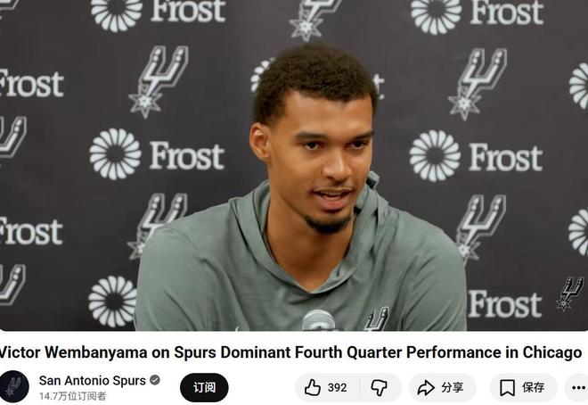相比于拿下3连胜继续位列西部第二,文班亚马再度打出历史级别表现显然更加值得马刺队开心。