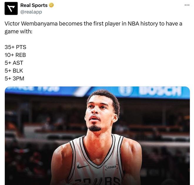 文班单场至少35分10篮板5助攻5盖帽5三分成NBA历史首人